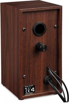 Das braune Holzgehäuse und die schwarze Frontabdeckung wirken dezent und passen sowohl ins Büro als auch ins Zuhause. Dank der kompakten Abmessungen passen die Lautsprecher bequem neben den Monitor auf den Tisch und liefern 2.0-Stereoklang ohne separaten Subwoofer.