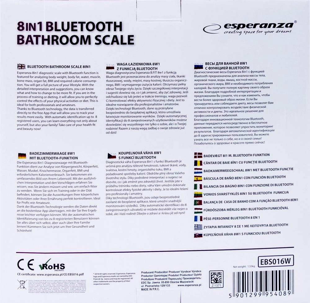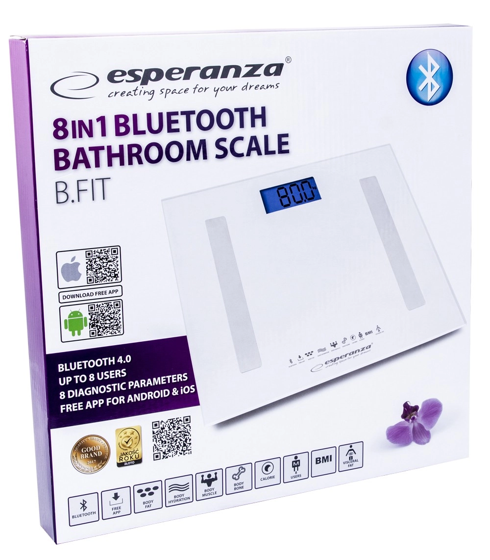 Entdecken Sie unsere innovative diagnostische Waage Esperanza „8-in-1“ B.FIT, die fortschrittliche BIA-Technologie (Bioelektrische Impedanzanalyse) für präzise Messungen der Körperzusammensetzung nutzt. Parameter einschließlich Gesundheitsdaten in rekordverdächtig kurzer Zeit. Die Daten werden drahtlos per Bluetooth direkt an eine benutzerfreundliche App übertragen, die Ihnen hilft, die Ergebnisse zu verfolgen und zu interpretieren.