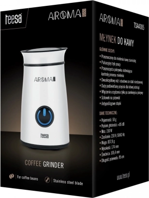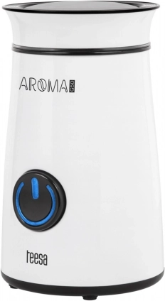 Die elektrische Kaffeemühle TEESA Aroma G50 ist ein praktischer Helfer für alle Liebhaber von Espresso und Filterkaffee. Dank des leistungsstarken Motors und der widerstandsfähigen Edelstahlklingen mahlt sie Kaffeebohnen schnell und gleichmäßig, damit Ihr Getränk sein volles Aroma und seinen Geschmack behält. Die minimalistische zylindrische Form mit modernem weißem Finish passt perfekt in jede Küche.