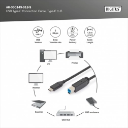 USB 3.0 Verbindungskabel Typ C auf B, SuperSpeed 5 Gbit/s, Power Delivery, 1,8 m, schwarz