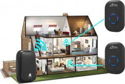 Drahtlose und batterielose Türklingel mit kinetischem Taster und einer Reichweite von bis zu 150 m. Bietet 51 Melodien, 4 Lautstärkestufen einschließlich Stummschaltung sowie einen Außentaster mit IP44 für zuverlässigen Betrieb bei jedem Wetter.
