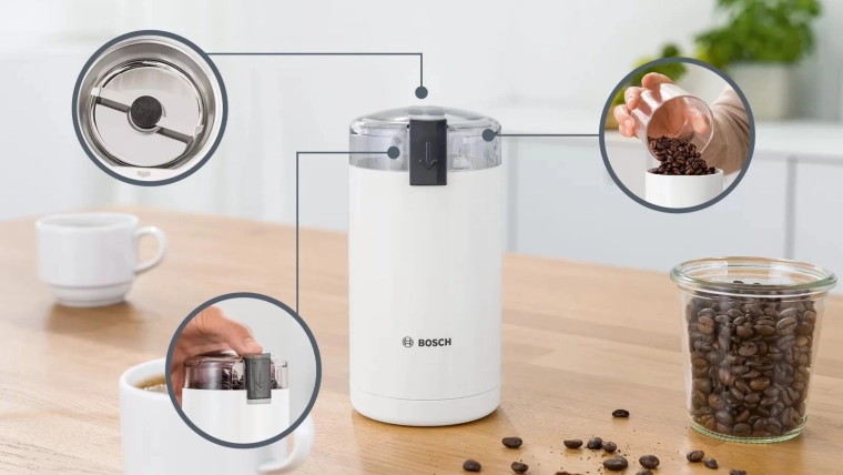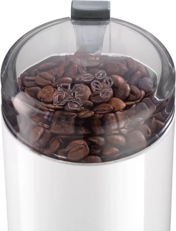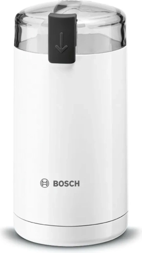 Kompakte elektrische Kaffeemühle Bosch TSM6A011W in elegantem Weiß für frisch gemahlenen Kaffee in wenigen Sekunden. Sie bietet eine Edelstahl-Mahlschale und ein zweiflügeliges Messer für gleichmäßiges Mahlen, einen Sicherheitsschalter gegen unbeabsichtigtes Einschalten und Betrieb nur mit geschlossenem Deckel für maximale Sicherheit.