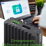 Das präzise gefertigte gerippte Aluminiumgehäuse zusammen mit dem internen Kühlkörper und Wärmeleitpad leitet Wärme effizient ab und sorgt für stabile Leistung ohne Throttling. Der praktische Schreibschutz‑Schalter schützt Ihre Daten, und die LED zeigt Betrieb und Laufwerkszugriff übersichtlich an. Im Lieferumfang sind Kabel für USB‑C und USB‑A enthalten – bereit für jeden Port.
