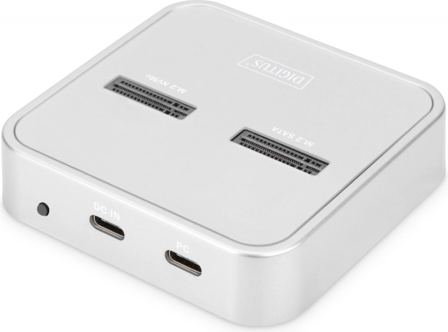Die universelle DIGITUS Dockingstation kombiniert zwei unabhängige Slots für M.2 SSDs – einen für NVMe (B+M Key / M‑Key) und einen für SATA (B+M Key) – plus einen SD‑Express‑7.1‑Leser. So erhalten Sie ein flexibles Zentrum für Datenverwaltung und ‑migration mit Unterstützung für Laufwerke bis zu 4 TB pro Slot und SD‑Karten bis zu 2 TB.