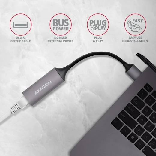 AXAGON USB-A 3.2 auf Gigabit-Ethernet-Adapter aus Metall. 10/100/1000 Mb/s, automatische Installation, Wake-on-LAN, VLAN, EEE, Realtek RTL8153. Titanfarben grau.