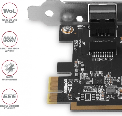 Die Karte unterstützt Plug & Play, Hardwarebeschleunigungen (Checksum Offload, Large Send), Full Duplex mit Flusskontrolle, VLAN-Tagging sowie Traffic-Priorisierung (802.1P). Auto MDI/MDIX sorgt für die automatische Erkennung gekreuzter Kabel, LED-Anzeigen signalisieren Aktivität, und moderne Wake‑on‑LAN-Szenarien ermöglichen das ferngesteuerte Aufwecken.