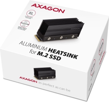 Der Aluminiumkühler AXAGON CLR-M2XL XL mit einer Höhe von 36 mm leitet die Wärme effizient von beiden Seiten des SSD ab und sorgt auch unter Dauerlast für eine stabile Leistung. Die universelle Konstruktion ist kompatibel mit ein- und beidseitigen M.2-SSDs (22 × 80 mm) sowohl mit SATA (AHCI)- als auch NVMe (PCIe)-Anbindung.