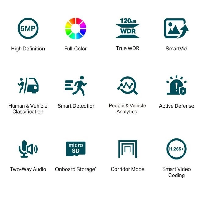 Die TP-Link VIGI C450 bietet eine sehr feine 5-MP-Auflösung und vollfarbige Nachtsicht dank empfindlichem Sensor und integrierten Spot-LEDs. Fortschrittliche SmartVid-Technologien wie True WDR, Smart IR und 3D DNR verbessern das Bild in anspruchsvollen Szenen deutlich und sorgen für klar lesbare Details für professionelle Überwachung.