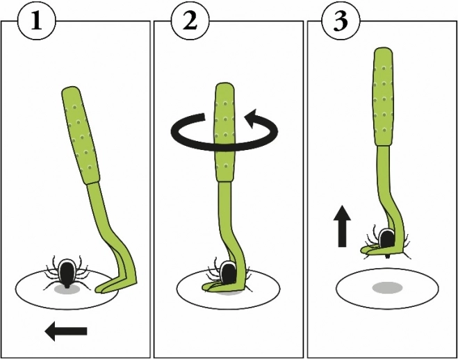 Die gebogene Form des Hakens zieht die Zecke nach leichtem Drehen heraus, ohne sie zu zerdrücken – das senkt das Risiko einer Infektionsübertragung.