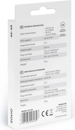 Das kompakte Design und die Kabellänge von 25 cm machen den Adapter ideal für den mobilen Einsatz. Dank der Unterstützung von Festplatten bis zu einer Kapazität von 10 TB eignet er sich hervorragend für die Verwaltung und Sicherung Ihrer wichtigen Daten. Die robuste Konstruktion und die zuverlässige Leistung machen den Savio Adapter zu einem praktischen Helfer für alltägliche Datenoperationen.