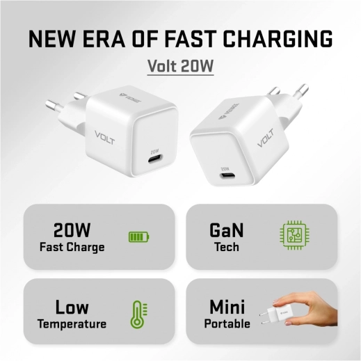 Dieses weiße VOLT-Ladegerät mit innovativer GaN (Gallium Nitride) Technologie bietet erhöhte Effizienz und kompakte Abmessungen für vielseitige Verwendung. Dank dieser Technologie ist das Ladegerät um 30 % kleiner als herkömmliche Ladegeräte, bietet jedoch eine Leistung von bis zu 20W. Ideal für Reisen oder als Ersatzladegerät dank seines geringen Gewichts und seiner Abmessungen.
