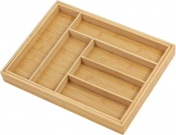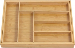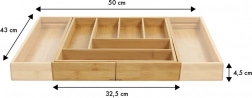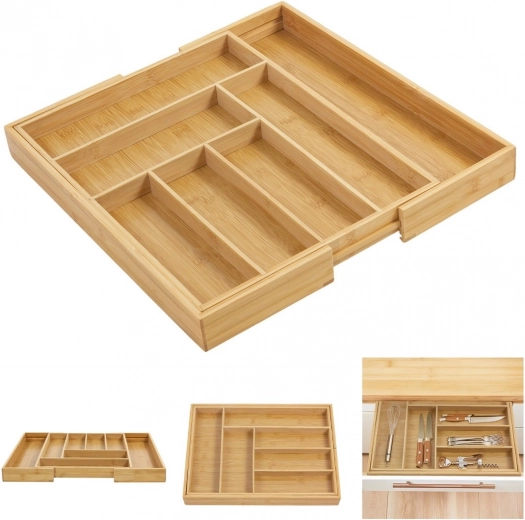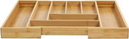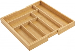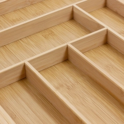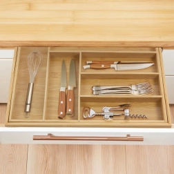 Behalten Sie Ordnung in der Küche mit dem universellen Bambus-Organizer, der sich Ihrer Schublade anpasst. Die erweiterbaren Seitenteile schaffen zusätzlichen Platz und halten zusammen mit festen Trennwänden alles übersichtlich an seinem Platz. Der natürliche Look aus massivem Bambus passt sowohl zu modernen als auch klassischen Interieurs.