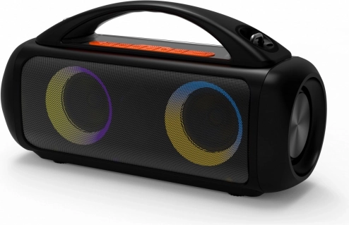 Genießen Sie kraftvollen 60‑W‑RMS‑Sound, Bluetooth 5.3 mit stabiler Verbindung, Karaoke mit 6,3‑mm‑Mikrofoneingang, TWS‑Kopplung, eine lange Akkulaufzeit von bis zu 16 Stunden und IPX5‑Wasserbeständigkeit in einem kompakten Gehäuse mit RGB‑Lichteffekten und universellem USB‑C‑Laden.