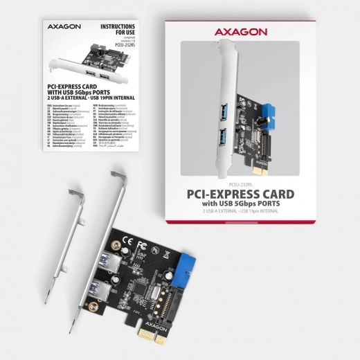 PCIe-Controller AXAGON mit 2× USB-A und 2× internem USB 5 Gbps, UASP, Low-Profile, SATA-Stromversorgung