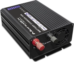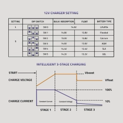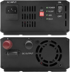 Mit dem DIP-Schalter wählen Sie aus mehreren Modi für verschiedene Chemien: LiFePO4, AGM, GEL, SLA/Blei (inkl. Ca, Nasszelle) sowie den Modus stabiler Netzteilbetrieb. Das robuste Aluminium-Chassis sorgt für bessere Wärmeabfuhr, der aktive Lüfter schützt die Elektronik bei hoher Last und nach vollständiger Ladung schaltet das Gerät automatisch in den Erhaltungs-/Standby-Modus.