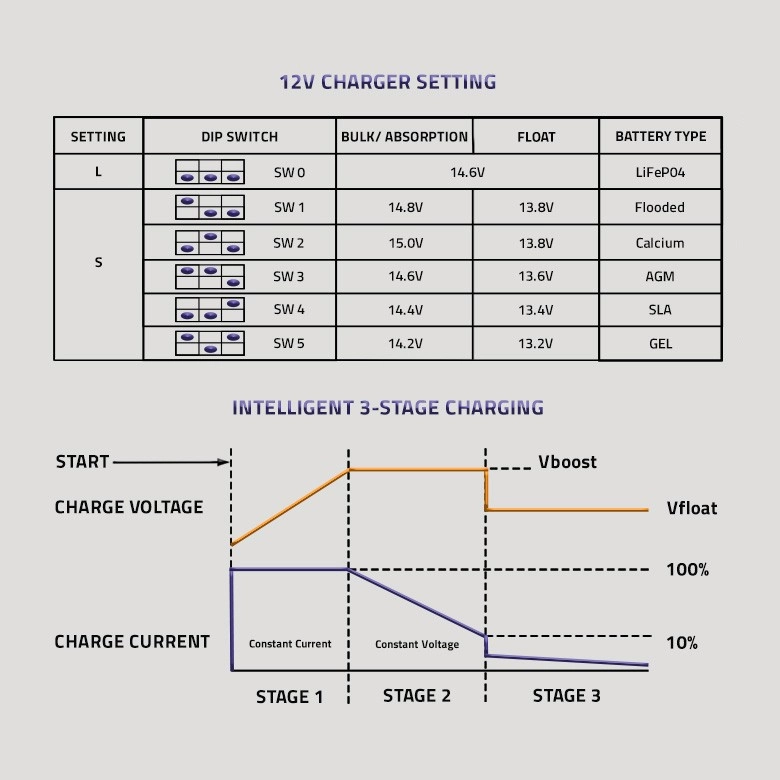 Über den DIP-Schalter wählen Sie das optimale Profil für LiFePO4, AGM, GEL, SLA/Blei (inkl. Ca, Nasszelle) oder den Modus eines stabilen Netzteils. Ein Ladegerät für mehrere Akkutypen.