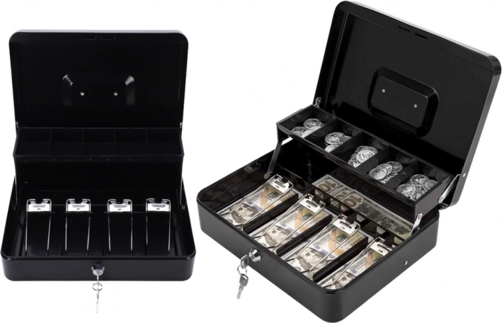 Langlebige und praktische Geldkassette Die Metall-Geldkassette ist eine stabile und sichere Lösung zur Aufbewahrung von Banknoten und Münzen. Sie wurde für eine maximale Organisation von Bargeld konzipiert und bietet eine funktionale Aufbewahrung in geräumigen Fächern. Hergestellt aus gewalztem Stahlblech, gewährleistet sie hohe Widerstandsfähigkeit gegen Beschädigungen sowie die Sicherheit des aufbewahrten Geldes und anderer Wertgegenstände. Vorteile der Geldkassette: