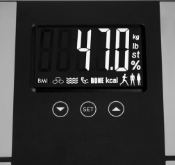 Die Bedienung ist maximal einfach: Taste SET und Pfeile zur Eingabe des Alters (18–80 Jahre), der Körpergröße (100–220 cm) und des Aktivitätsniveaus 1–5, Auswahl des Profils Frau/Mann/Sportler sowie bequemes Umschalten der Einheiten kg/lb/st über die Taste UNIT an der Unterseite. Nach der Messung schaltet sich die Waage nach 60 s automatisch ab, spart Batterie und ist für die nächste Nutzung bereit.