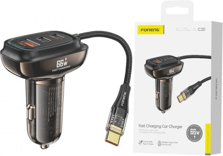 FONENG C20 Kfz‑Ladegerät 66 W mit 3 Ports (USB-A + 2× USB-C), Schnellladen PD/QC/SCP/PPS, 12–24 V, robuste Ausführung und mehrstufiger Schutz.