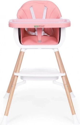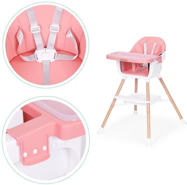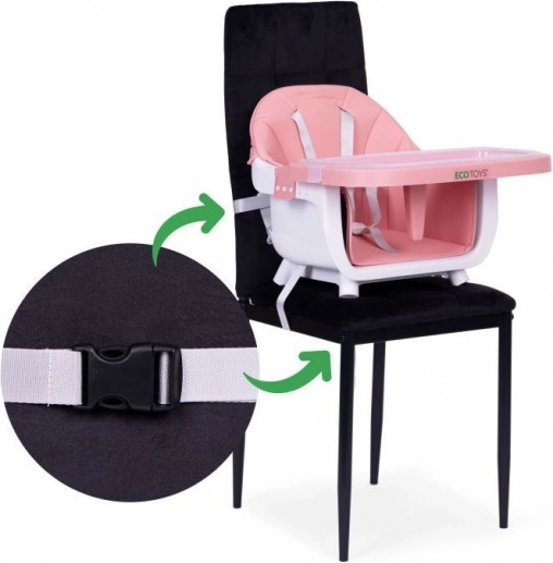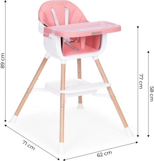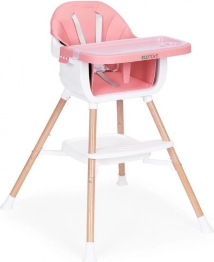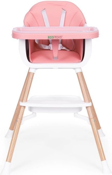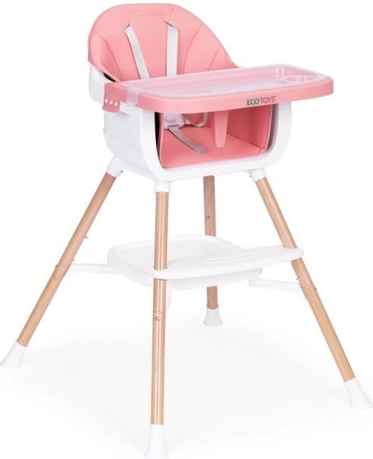 Praktischer 2-in-1 Kinder-Hochstuhl von ECOTOYS für Kinder von 6 bis 36 Monaten, der einen Hochstuhl und einen separaten Sitz für einen normalen Stuhl vereint. Er bietet eine stabile Metallkonstruktion, einen Bezug aus robuster und leicht abwischbarer Eco-Leder, ein zweilagiges, abnehmbares Tablett spülmaschinengeeignet, einen 5-Punkt-Sicherheitsgurt, rutschfeste Endkappen, eine Rutschschutzbarriere sowie ein praktisches Ablagefach unter dem Sitz. Maximale Tragfähigkeit 20 kg.