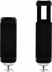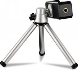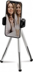 Der Stativ umfasst ein 2-in-1-System, das als Halterung für Smartphones sowie mit einem 1/4''-Gewinde für Kameras funktioniert, was seine Variabilität erhöht.