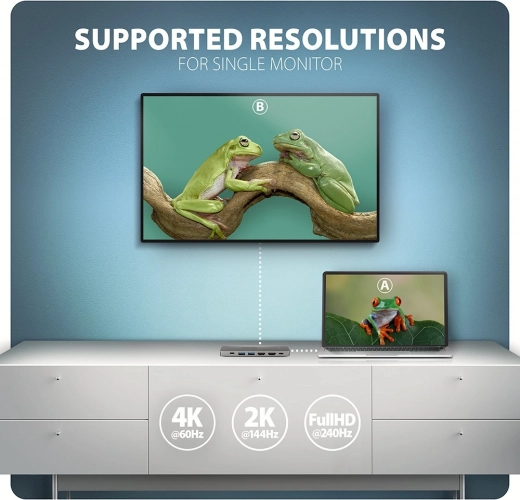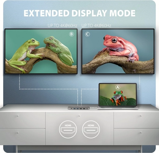Der Hub bietet zwei USB‑A 5 Gbps und einen USB‑C 5 Gbps Datenport, bewältigt dauerhaft auch mehrere externe Laufwerke und ermöglicht das Laden von Telefonen und Tablets mit bis zu 1,5 A/5 V. Das doppelte HDMI überträgt Bildsignale bis zu 4K/60 Hz (unterstützt auch 2K/120–144 Hz und 1080p/240 Hz) einschließlich HDR und Mehrkanal‑Audio. Das Metallgehäuse sorgt für Robustheit und effiziente Wärmeabfuhr.