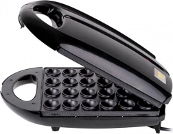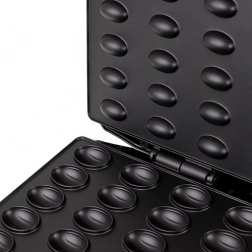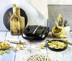 Die starke Leistung von bis zu 1600 W verteilt die Wärme gleichmäßig, die Kontrollleuchte informiert über die Backbereitschaft und das robuste Bakelitgehäuse mit thermoisolierten Griffen gewährleistet eine bequeme und sichere Nutzung. Die Deckelverriegelung hält die Formen fest zusammen für gleichmäßiges Durchbacken.