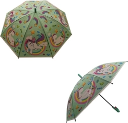 Der niedliche Kinderschirm mit Einhornmotiv schützt Ihre Kinder vor Regen und begeistert zugleich mit einem verspielten Design. Dank des Automatik-Mechanismus öffnet er schnell, die robuste Stahlkonstruktion sorgt für Stabilität und der Kunststoffgriff liegt auch in kleinen Händen bequem.