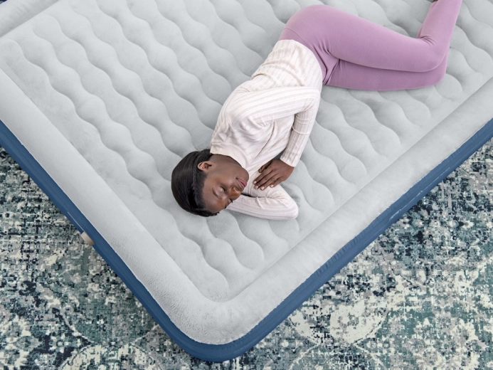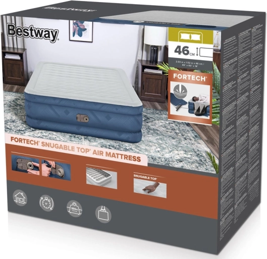 Das aufblasbare BESTWAY-Bett besteht aus dem robusten Material Tough Guard Fortech, das die Flexibilität von PVC mit der Festigkeit von Gewebe kombiniert. Die weiche beflockte Oberfläche ist angenehm, rutschfest und erhöht den Schlafkomfort. Die stabile Wave Beam Konstruktion verteilt das Gewicht gleichmäßig und verhindert das Einsinken.