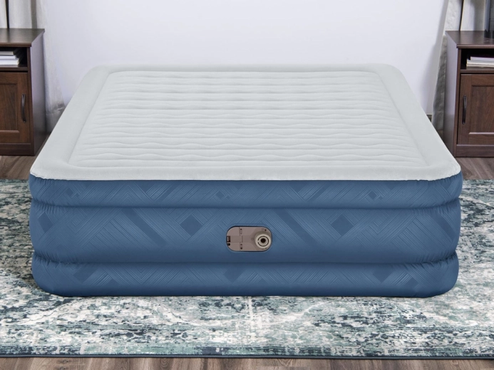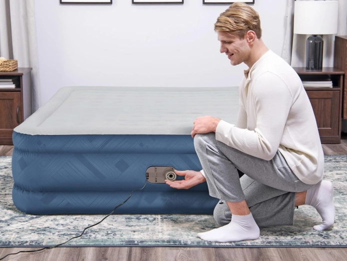 Enthalten ist eine integrierte elektrische Pumpe 220–240 V, die die Matratze in etwa 3 Minuten aufbläst. Für Orte ohne Strom kann auch eine Hand- oder Fußpumpe verwendet werden. Ein Sicherheitsventil hilft, den Druck zu halten und beugt ungewolltem Luftverlust vor. Die maximale Tragfähigkeit beträgt 350 kg und sorgt so für Zuverlässigkeit auch bei intensiver Nutzung.