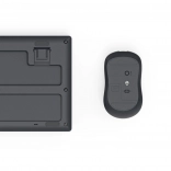 Die Tastatur ist mit klappbaren Füßen für die Anpassung des Winkels ausgestattet, während die Maus eine symmetrische Form und polymerische Füße hat.