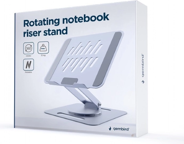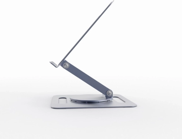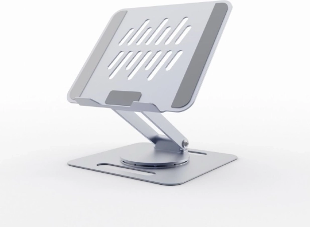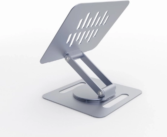 Universeller Ständer für Laptops bis 15,6″ in elegantem Grau bietet stufenlose Höhenverstellung, 360°-Drehung und stabile Metallkonstruktion. Die offene Plattform sorgt für hervorragende Kühlung, während Silikonpolster und eine Sicherheitsleiste das Gerät sicher an Ort und Stelle halten. Dank der klappbaren Konstruktion ideal für den Schreibtisch und unterwegs.