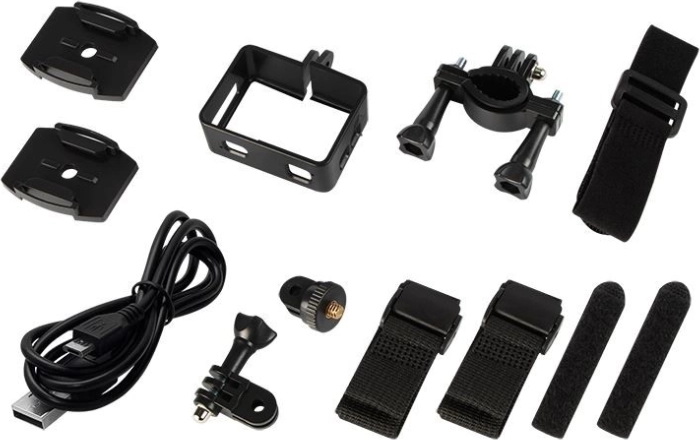 Wasserdichtes Gehäuse, Halterungen (Helm/Lenker), Rahmenhalter, Klebehalter, Gurte, USB‑Kabel, Fernbedienung