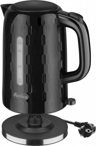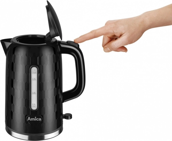 Der moderne Amica Wasserkocher in elegantem Schwarz mit strukturierter Wabenoberfläche wird zum zuverlässigen Helfer für schnelles Erhitzen von Wasser. Mit seinem Fassungsvermögen von 1,7 l versorgen Sie bequem die ganze Familie, während das flache Heizelement die Reinigung erleichtert und für effiziente Erwärmung sorgt.