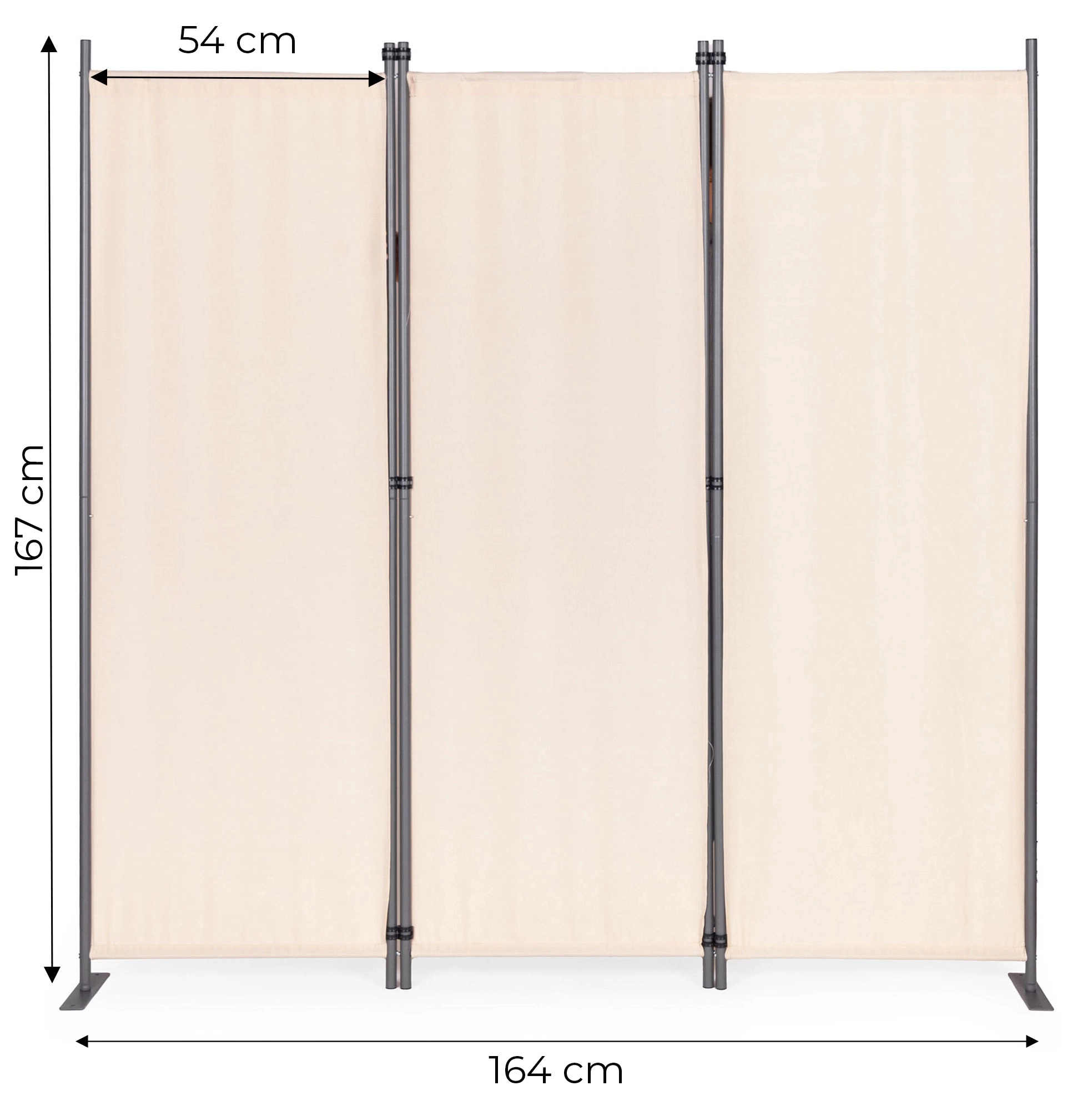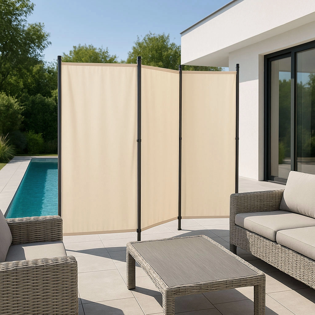 Der klappbare Gartentrenner MultiGarden ist eine universelle Lösung für Schutz und Dekoration von Außenbereichen. Er eignet sich hervorragend für den Garten, die Terrasse oder den Balkon, wo er Privatsphäre und Schutz vor Wind bietet und gleichzeitig als Raumtrenner dient. Dank der Verwendung von robustem 160 g/m² Polyester ist der Paravent wetterbeständig gegen UV-Strahlung und Regen. Mit dem leichten und klappbaren Design kann er leicht verschoben und nach Bedarf eingerichtet werden. Eleganz in der beigen Farbe verleiht Stil und unterstreicht die Ästhetik.