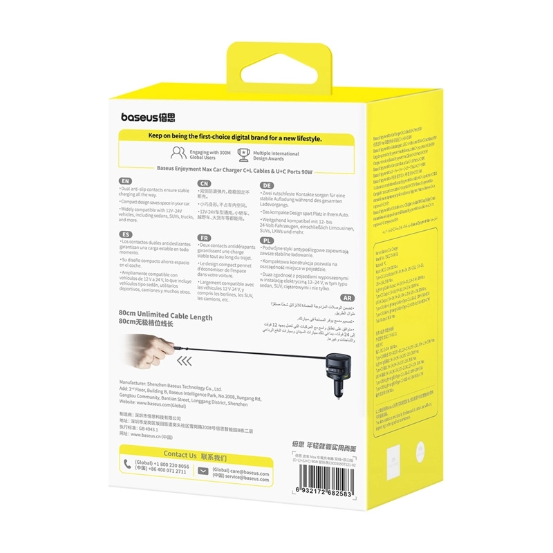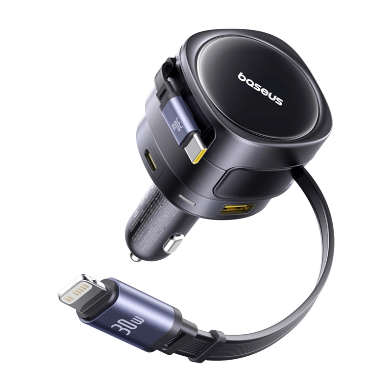 Das Baseus Autoladegerät bietet die Möglichkeit, vier Geräte gleichzeitig aufzuladen dank der zwei eingebauten Kabel (USB-C und Lightning) zusammen mit zwei zusätzlichen Anschlüssen (USB-C und USB-A).