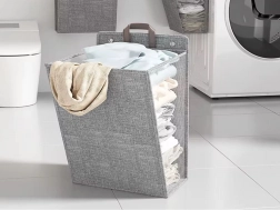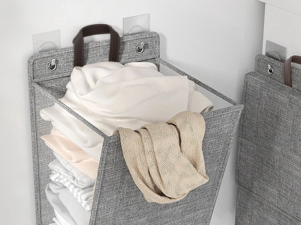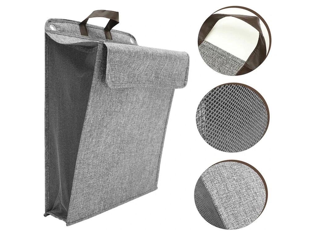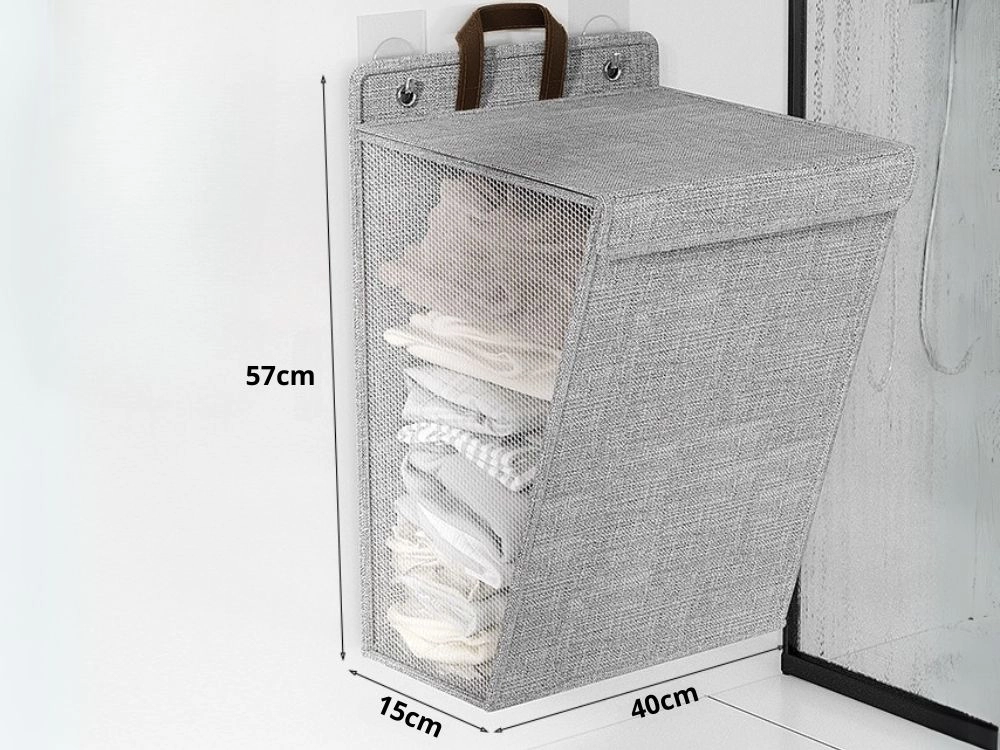 Der elegante graue Wäschekorb ist für kleine Bäder, Ankleiden und Waschküchen konzipiert. Durch das Aufhängen an Wand oder Tür wird der Raum effizient genutzt, während die verstärkten Seiten selbst bei voller Belastung die Form halten. Das atmungsaktive Netz fördert die Luftzirkulation, sodass die Wäsche nicht muffig wird.