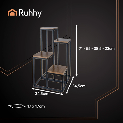 Der stilvolle stehende Blumenständer RUHHY ist eine vierstufige Konstruktion, die es ermöglicht, mehrere Pflanzen auf kleinem Raum auszustellen. Modernes Design mit Metallrahmen und Holzregalen passt in jedes Interieur. Stabile und robuste Struktur kann bis zu 50 kg tragen und ist mit Bodenschutz durch verstellbare Füße ausgestattet.
