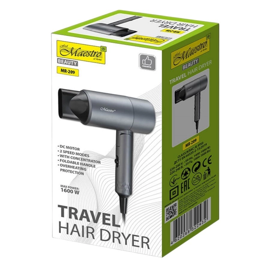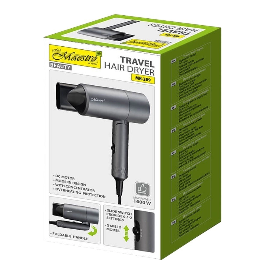 Reiseföhn Maestro MR-209 mit einer Leistung von 1600W ist ideal für schnelles und effizientes Haartrocknen. Der klappbare Griff und das kompakte Design bieten Komfort und einfache Handhabung.