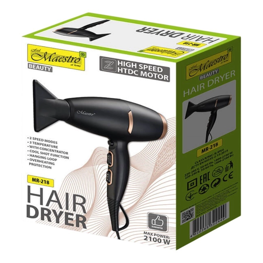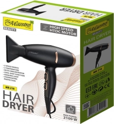 Der Haartrockner Maestro 2100W sorgt für schnelles und effektives Trocknen der Haare dank seinem leistungsstarken HTDC-Motor und 2100 W Leistung.