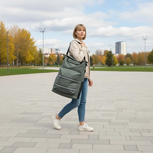 Dank der großen Räder und des drehbaren Griffs ist die Handhabung selbst auf unebenem Untergrund geschmeidig. Reflektierende Streifen erhöhen die Sichtbarkeit in der Dämmerung, sodass Sie auch bei Dunkelheit sicher unterwegs sind. Die Tasche lässt sich leicht vom Gestell abnehmen, was das Tragen und Verstauen erleichtert.