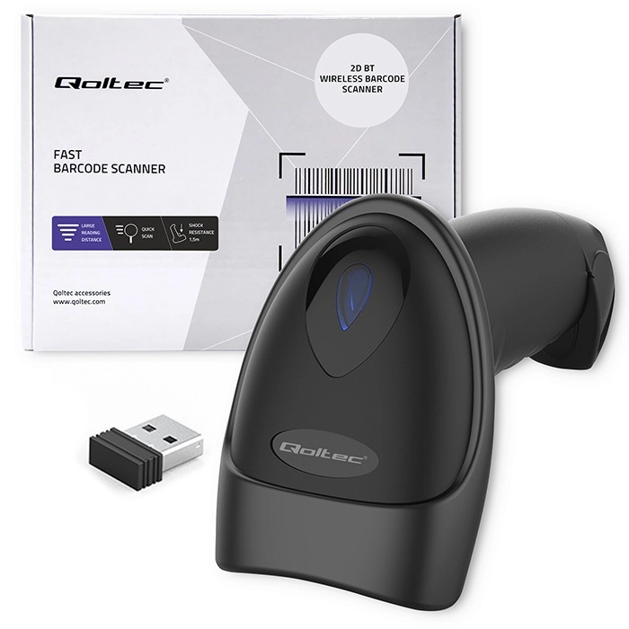 Der schwarz-gelbe Qoltec Handscanner liefert präzises und schnelles Scannen von 1D- und 2D-Codes mit drahtloser Verbindung über Bluetooth und USB.