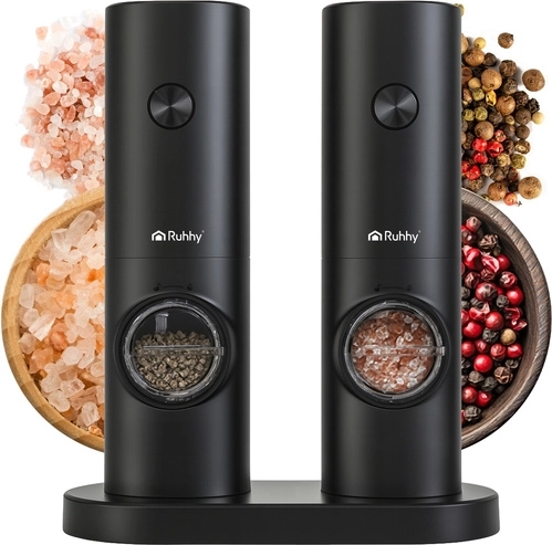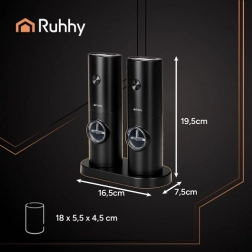 Elektrische Pfeffer- und Salzmühlen der Marke RUHHY sind das ideale Zubehör für alle, die Wert auf Qualität und Ästhetik legen. Die universelle Verwendung ermöglicht den Einsatz für verschiedene Gewürzarten, einschließlich Kräutern. Das Mahlen erfolgt durch einen Keramikmechanismus, der langlebig und präzise ohne metallischen Geschmack ist.