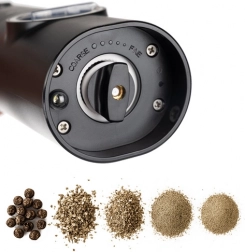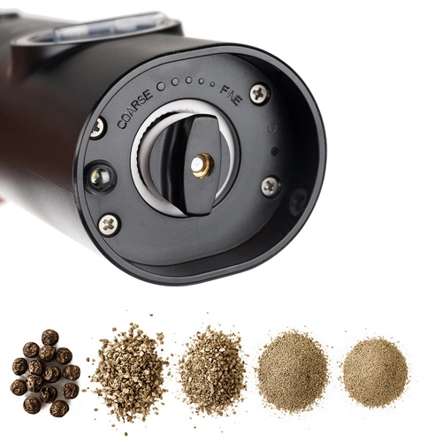 Dank der LED-Beleuchtung haben Sie die Kontrolle über die Gewürzmenge auch bei gedämpftem Licht. Ein transparentes Fenster zeigt Ihnen immer, wie viel Gewürz noch übrig ist. Die Mühlen werden von einer Batterie angetrieben (4× AAA pro Mühle) und sind einfach mit einem Knopfdruck zu bedienen.