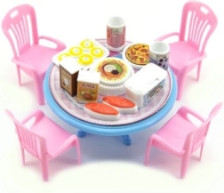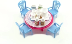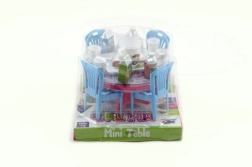 Ein niedliches Set für Puppen: ein Kunststofftisch und Stühle mit Zubehör in kompakter Größe von 12 cm. Perfekt fürs Kinderzimmer und fördert das kreative Spiel, die Entwicklung der Fantasie und Rollenspiele. Verfügbar in 3 Farbvarianten. Geeignet für Kinder ab 3 Jahren.