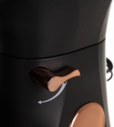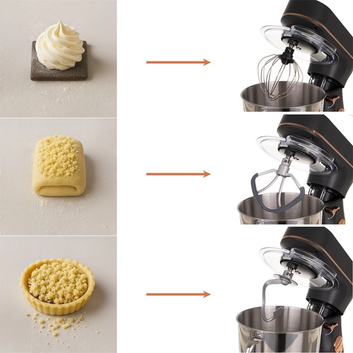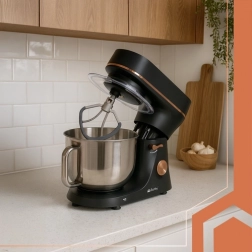 Zum Lieferumfang gehört ein praktischer Spritzschutzdeckel für eine saubere Küche, eine Schüssel mit Griff für einfaches Handling und Antirutschfüße für Stabilität. Die Maschine ist BPA-frei, verfügt über Überhitzungsschutz, einen Standby-Modus sowie automatisches Dimmen/Ausschalten des Displays. Teile sind spülmaschinengeeignet.