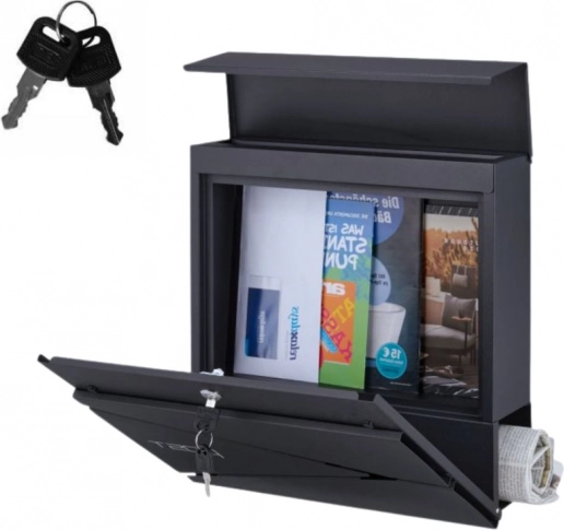 Das geräumige Gehäuse nimmt Post im A4-Format auf, der 3,5 cm breite Einwurf erleichtert die Zustellung und der integrierte Zeitungshalter im unteren Teil ermöglicht das Entnehmen der Presse, ohne das Hauptfach zu öffnen. Für sichere Aufbewahrung sorgen Türen mit Schloss und zwei Schlüsseln. Die Montage geht schnell – im Lieferumfang sind Dübel und Unterlegscheiben enthalten.