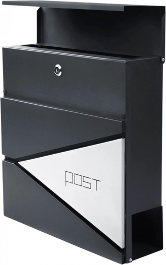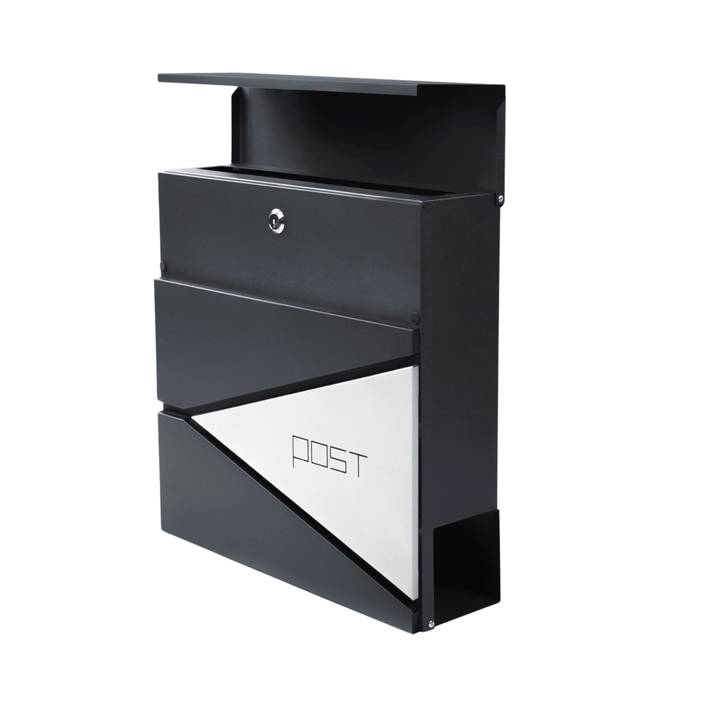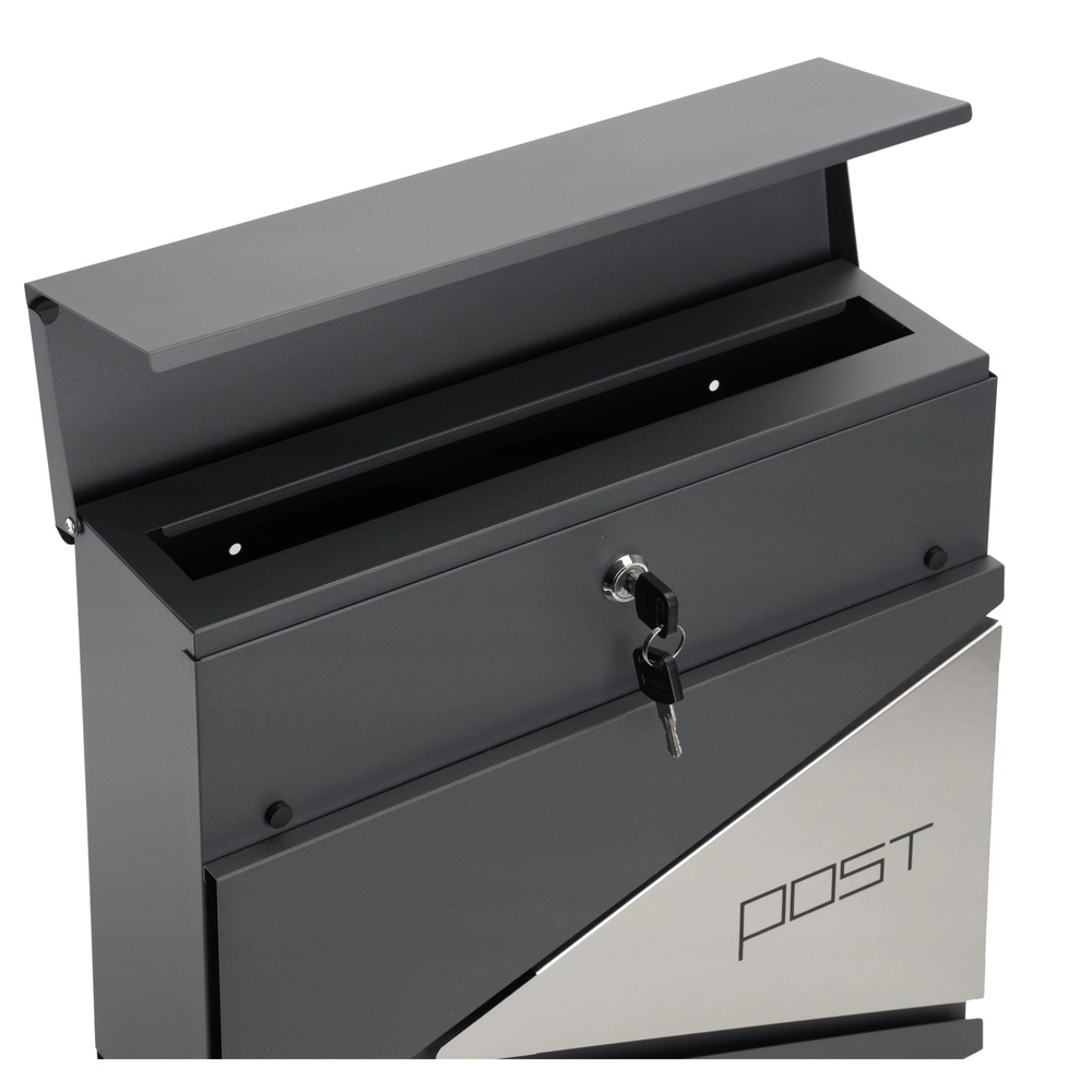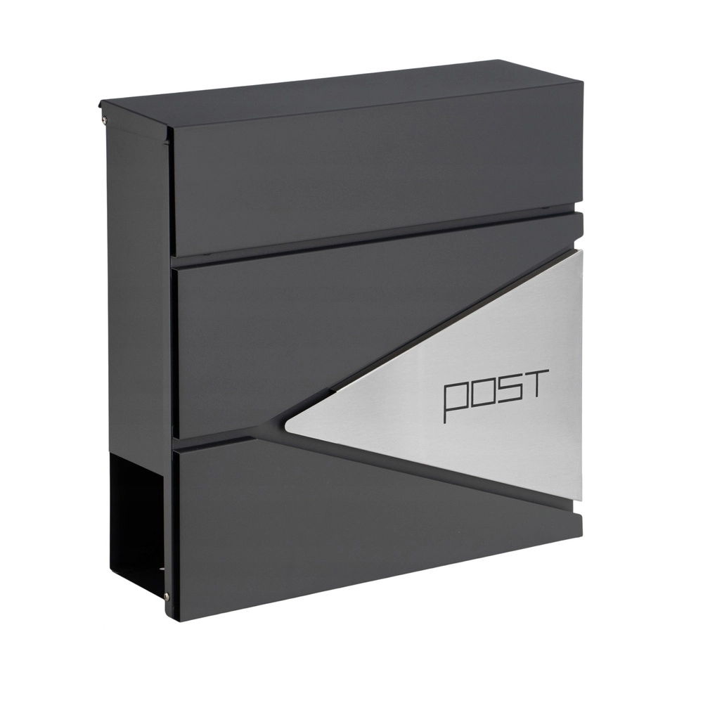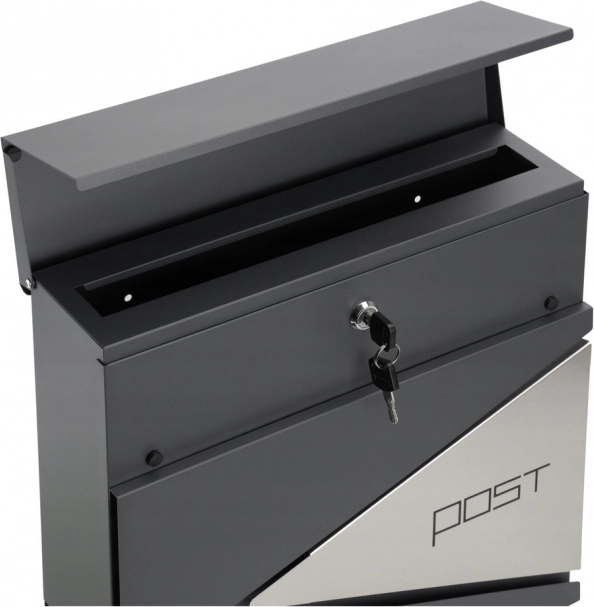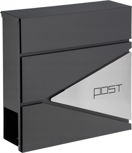 Dieser anthrazitfarbene Briefkasten zeichnet sich durch ein klares Design mit geometrischen Ausschnitten und dem minimalistischen Schriftzug „POST“ aus. Dank robuster Materialien und Pulverbeschichtung ist er ideal für den langfristigen Außeneinsatz.