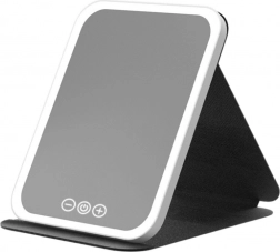 Eleganter klappbarer LED-Spiegel, ideal für tägliches Make-up und Hautpflege. Er bietet drei Lichtfarben (kalt, warm, natürlich), eine stufenlose Helligkeitsregelung über Touch-Bedienung und ein praktisches Etui mit Standfunktion mit drei Aufstellmöglichkeiten. Dank des integrierten 600-mAh-Akkus mit USB-Ladung ist er sowohl zu Hause als auch unterwegs bequem nutzbar.