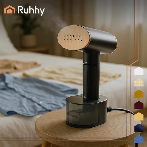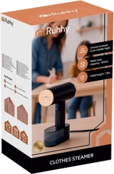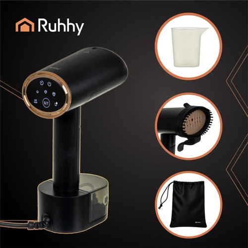 Moderner RUHHY-Dampfbügler mit 2000 W Leistung, Dual-Drucksystem und 3 Dampfstufen glättet schnell und schonend Falten auf allen Stoffarten. Ermöglicht vertikales und horizontales Dampfen, verfügt über einen Touchscreen und im Lieferumfang ist praktisches Zubehör inklusive Reiseetui enthalten.